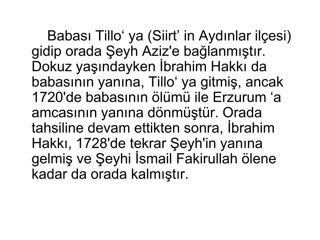 Babası Tillo‘ ya (Siirt’ in Aydınlar ilçesi) gidip orada Şeyh Aziz'e bağlanmıştır. Dokuz yaşındayken İbrahim Hakkı da babasının yanına, Tillo‘ ya gitmiş, ancak 1720'de babasının ölümü ile Erzurum ‘a amcasının yanına dönmüştür. Orada tahsiline devam ettikten sonra, İbrahim Hakkı, 1728'de tekrar Şeyh'in yanına gelmiş ve Şeyhi İsmail Fakirullah ölene kadar da orada kalmıştır.
