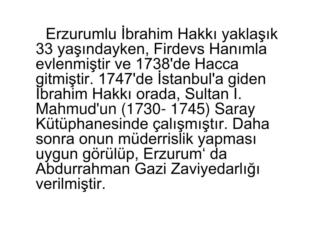 ERZURUMLU İBRAHİM HAKKI EFENDİ. Erzurumlu İbrahim Hakkı 18 Mayıs 1703 tarihinde Hasan kale'de dünyaya gelmiştir. Babası Derviş Osman Efendi, annesi Şerife Hanife Hanım'dır. Kendisi bu doğum tarihini şöyle ifade etmektedir: Hicretin tarihi bin yüz on beş oldu ol bahar;