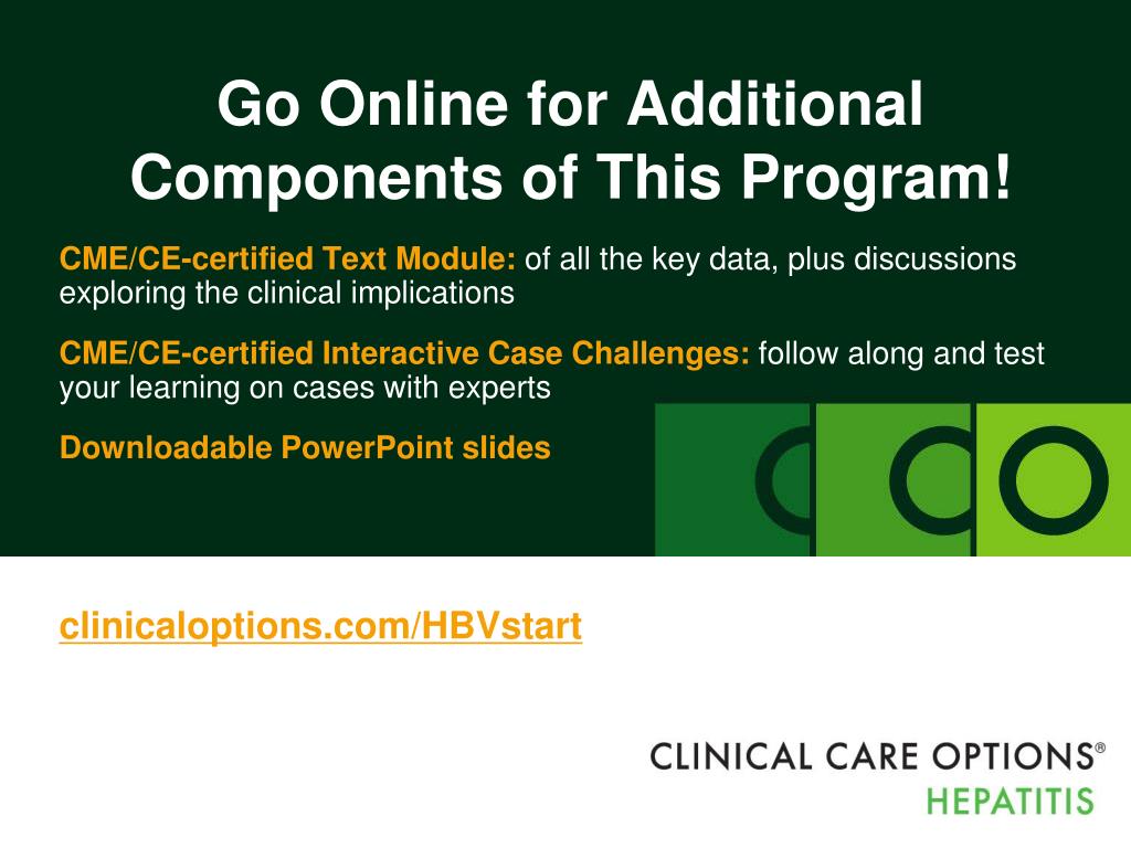 Go Online for Additional Components of This Program! CME/CE-certified Text Module: of all the key data, plusdiscussions exploring the clinical implications CME/CE-certified Interactive Case Challenges: follow along and test your learning on cases with experts Downloadable PowerPoint slides clinicaloptions.com/HBVstart