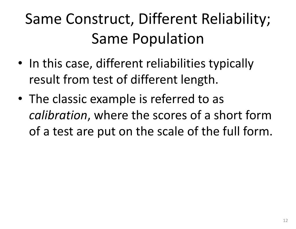 Same Construct, Different Reliability; Same Population In this case, different reliabilities typically result from test of different length. The classic example is referred to as calibration, where the scores of a short form of a test are put on the scale of the full form.