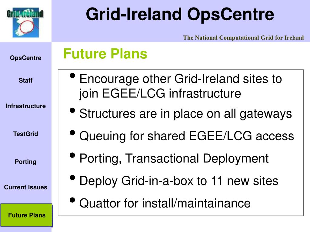 Encourage other Grid-Ireland sites to join EGEE/LCG infrastructure Structures are in place on all gateways Queuing for shared EGEE/LCG access Porting, Transactional Deployment Deploy Grid-in-a-box to 11 new sites Quattor for install/maintainance Future Plans Future Plans