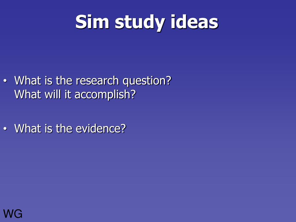 Sim study ideas • What is the research question? What will it accomplish? • What is the evidence? WG