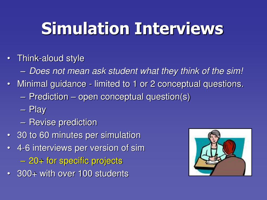 Simulation Interviews • Think-aloud style • Does not mean ask student what they think of the sim! • Minimal guidance - limited to 1 or 2 conceptual questions. • Prediction – open conceptual question(s) • Play • Revise prediction • 30 to 60 minutes per simulation • 4-6 interviews per version of sim • 20+ for specific projects • 300+ with over 100 students
