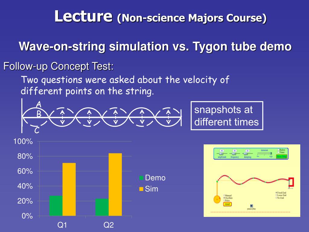 A snapshots at different times B C Lecture (Non-science Majors Course) Wave-on-string simulation vs. Tygon tube demo Follow-up Concept Test: Two questions were asked about the velocity of different points on the string.
