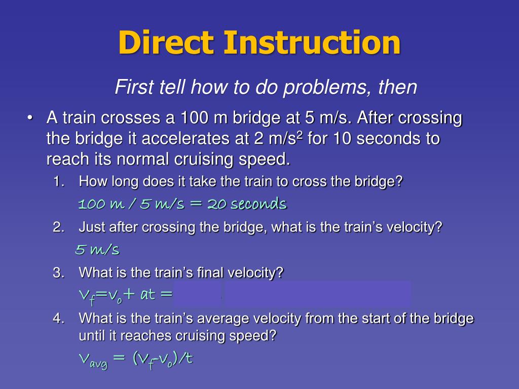 Direct Instruction First tell how to do problems, then • A train crosses a 100 m bridge at 5 m/s. After crossing the bridge it accelerates at 2 m/s2 for 10 seconds to reach its normal cruising speed. • How long does it take the train to cross the bridge? 100 m / 5 m/s = 20 seconds • Just after crossing the bridge, what is the train’s velocity? 5 m/s • What is the train’s final velocity? Vf=vo+ at = 0 m/s + 2 m/s2 10s = 20 • What is the train’s average velocity from the start of the bridge until it reaches cruising speed? Vavg = (Vf-vo)/t