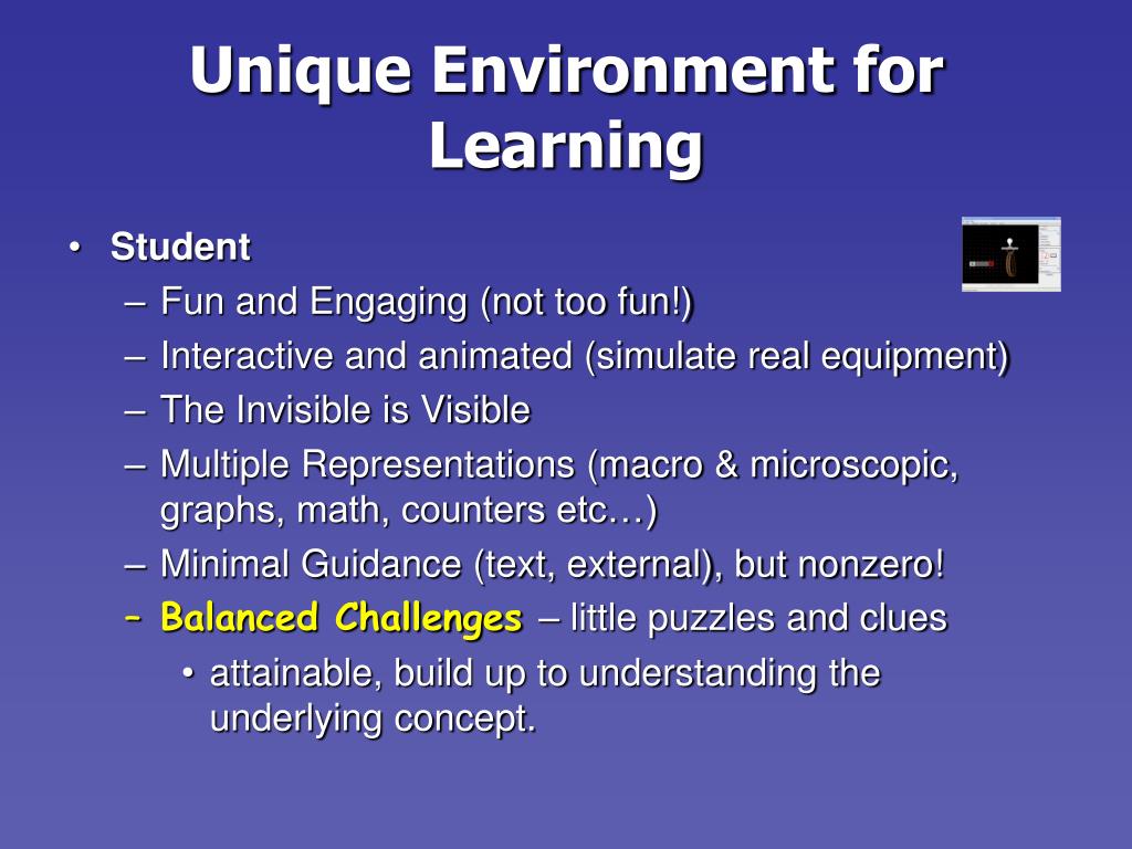 Unique Environment for Learning • Student • Fun and Engaging (not too fun!) • Interactive and animated (simulate real equipment) • The Invisible is Visible • Multiple Representations (macro & microscopic, graphs, math, counters etc…) • Minimal Guidance (text, external), but nonzero! • Balanced Challenges – little puzzles and clues • attainable, build up to understanding the underlying concept.