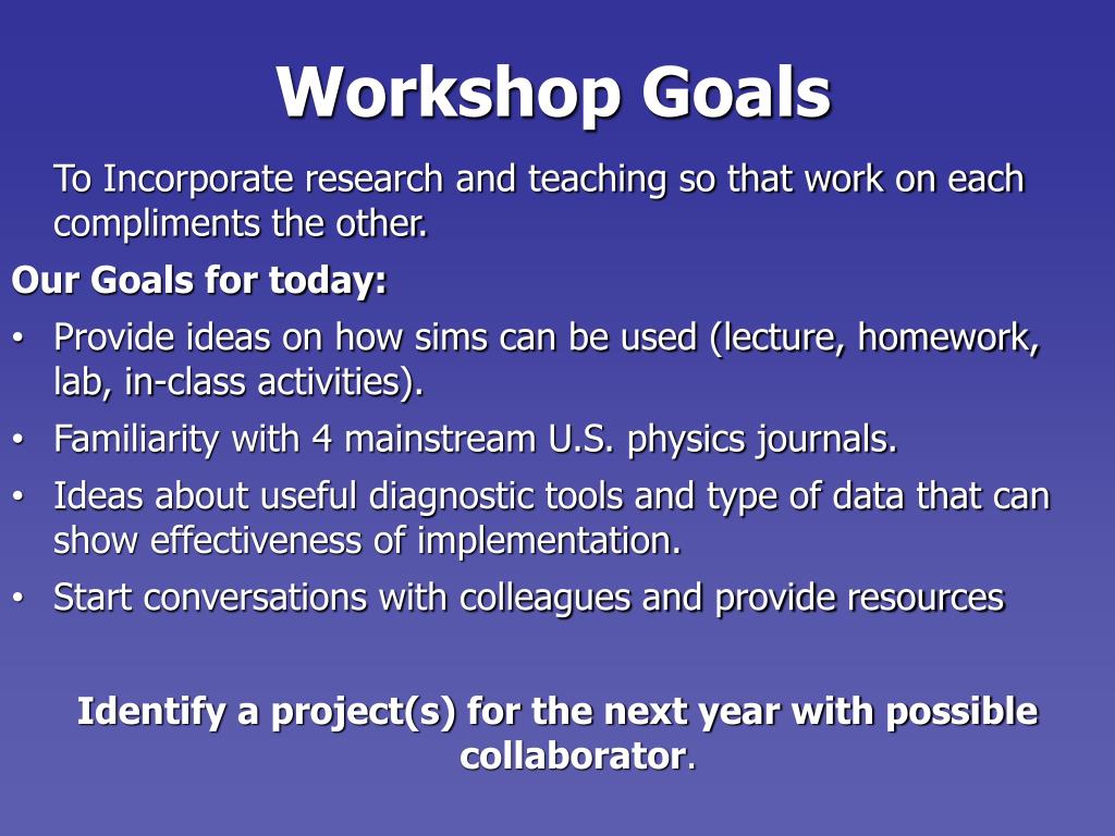 Workshop Goals • To Incorporate research and teaching so that work on each compliments the other. • Our Goals for today: • Provide ideas on how sims can be used (lecture, homework, lab, in-class activities). • Familiarity with4 mainstream U.S. physics journals. • Ideas about useful diagnostic tools and type of data that can show effectiveness of implementation. • Start conversations with colleagues and provide resources • Identify a project(s) for the next year with possible collaborator.
