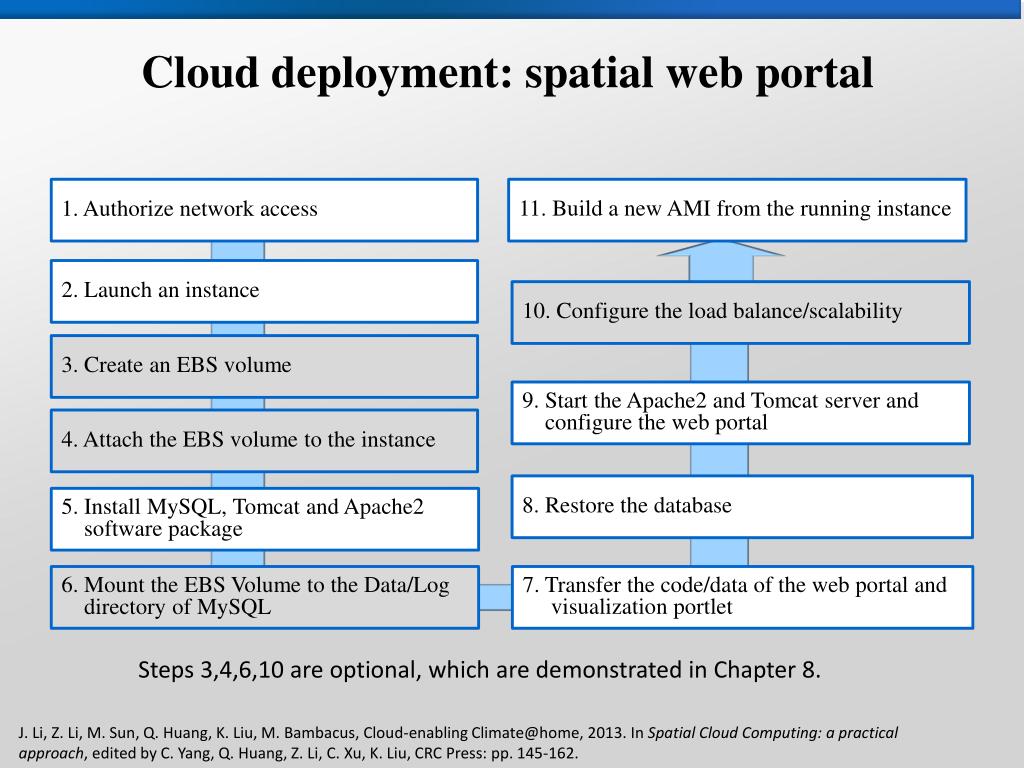 Cloud deployment: spatial web portal 1. Authorize network access 11. Build a new AMI from the running instance 2. Launch an instance 10. Configure the load balance/scalability 3. Create an EBS volume 9. Start the Apache2 and Tomcat server and configure the web portal 4. Attach the EBS volume to the instance 8. Restore the database 5. Install MySQL, Tomcat and Apache2 software package Steps 3,4,6,10 are optional, which are demonstrated in Chapter 8. 6. Mount the EBS Volume to the Data/Log directory of MySQL 7. Transfer the code/data of the web portal and visualization portlet