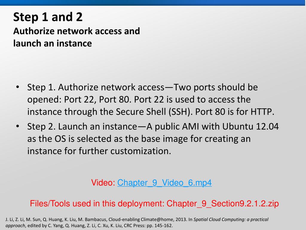 Step 1 and 2Authorize network access andlaunch an instance • Step 1. Authorize network access—Two ports should be opened: Port 22, Port 80. Port 22 is used to access the instance through the Secure Shell (SSH). Port 80 is for HTTP. • Step 2. Launch an instance—A public AMI with Ubuntu 12.04 as the OS is selected as the base image for creating an instance for further customization. • Video: Chapter_9_Video_6.mp4 • Files/Tools used in this deployment: Chapter_9_Section9.2.1.2.zip