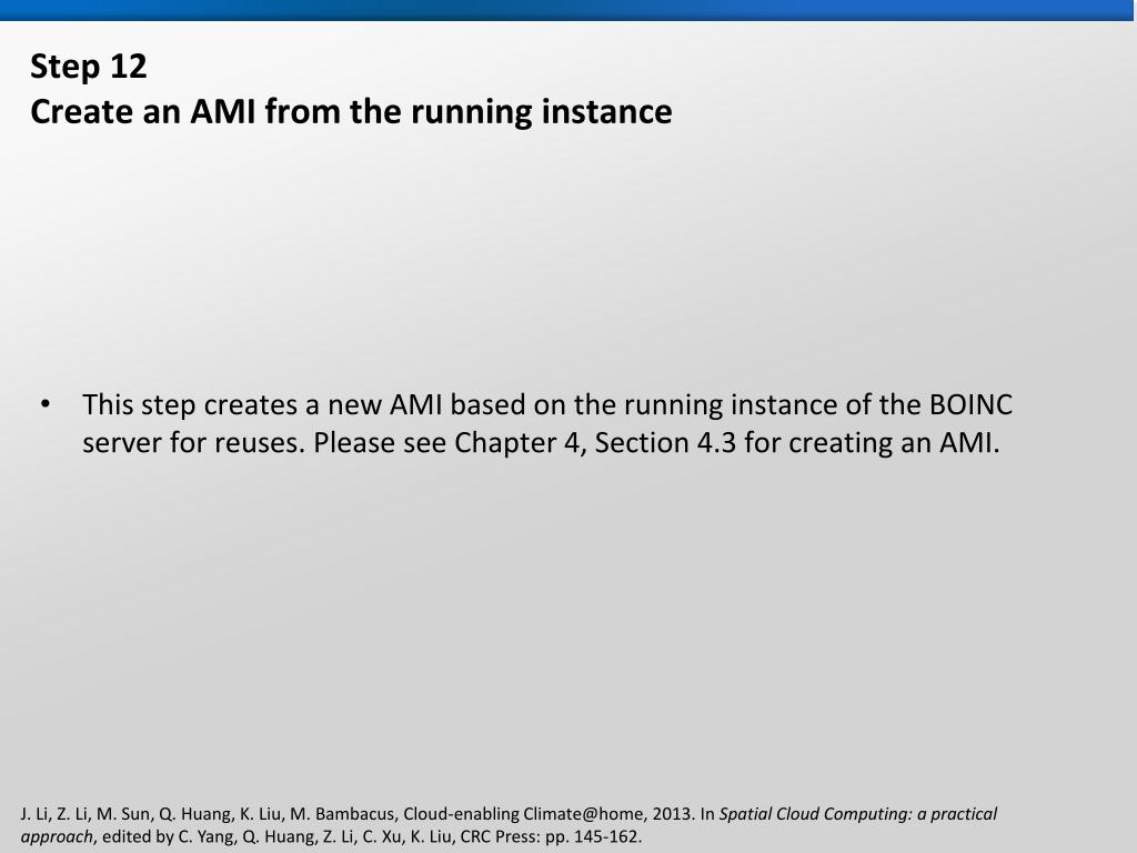 Step 12Create an AMI from the running instance • This step creates a new AMI based on the running instance of the BOINC server for reuses. Please see Chapter 4, Section 4.3 for creating an AMI.