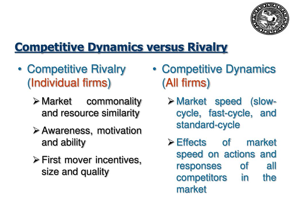 Competitive Rivalry (Individual firms) Market commonality and resource similarity Awareness, motivation and ability First mover incentives, size and quality Competitive Dynamics (All firms) Market speed (slow-cycle, fast-cycle, and standard-cycle Effects of market speed on actions and responses of all competitors in the market Competitive Dynamics versus Rivalry