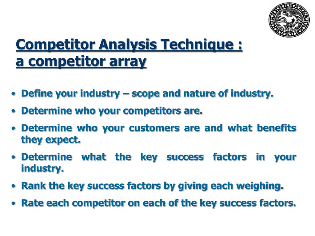 Competitor Analysis Technique : a competitor array • Define your industry – scope and nature of industry. • Determine who your competitors are. • Determine who your customers are and what benefits they expect. • Determine what the key success factors in your industry. • Rank the key success factors by giving each weighing. • Rate each competitor on each of the key success factors.