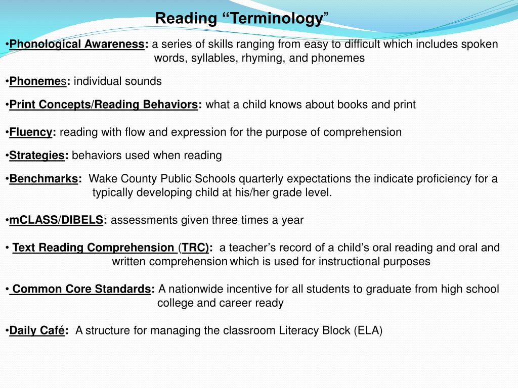 Reading “Terminology” • Phonological Awareness: a series of skills ranging from easy todifficult which includes spoken • words, syllables, rhyming, and phonemes • Phonemes: individual sounds • Print Concepts/Reading Behaviors: what a child knows about books and print • Fluency: reading with flow and expression for the purpose of comprehension • Strategies: behaviors used when reading • Benchmarks: Wake County Public Schools quarterly expectations the indicate proficiency for a • typically developing child at his/her grade level. • mCLASS/DIBELS: assessments given three times a year • Text Reading Comprehension (TRC): a teacher’s record of a child’s oral reading and oral and • written comprehensionwhich is used for instructional purposes • Common Core Standards: A nationwide incentive for all students to graduate from high school • college and career ready • Daily Café: A structure for managing the classroom Literacy Block (ELA)
