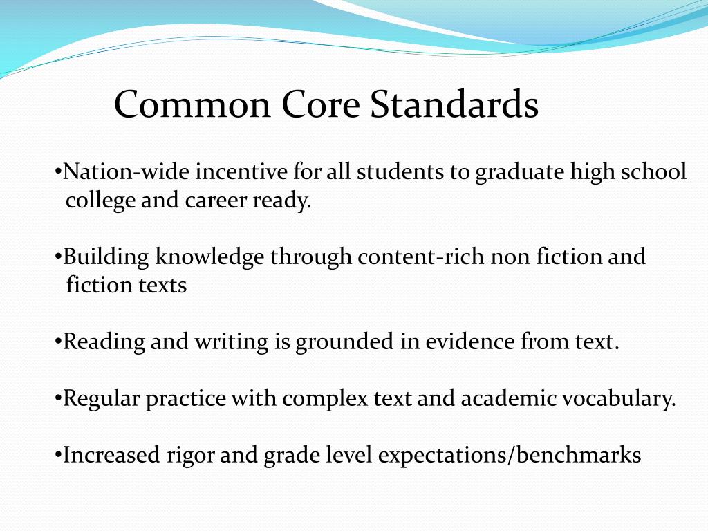 Common Core Standards • Nation-wide incentive for all students to graduate high school • college and career ready. • Building knowledge through content-rich non fiction and • fiction texts • Reading and writing is grounded in evidence from text. • Regular practice with complex text and academic vocabulary. • Increased rigor and grade level expectations/benchmarks