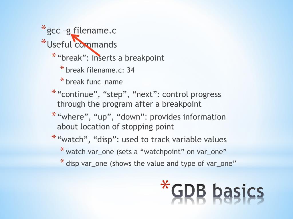 gcc –g filename.c • Useful commands • “break”: inserts a breakpoint • break filename.c: 34 • break func_name • “continue”, “step”, “next”: control progress through the program after a breakpoint • “where”, “up”, “down”:provides information about location of stopping point • “watch”, “disp”: used to track variable values • watch var_one (sets a “watchpoint” on var_one” • dispvar_one (shows the value and type of var_one” GDB basics