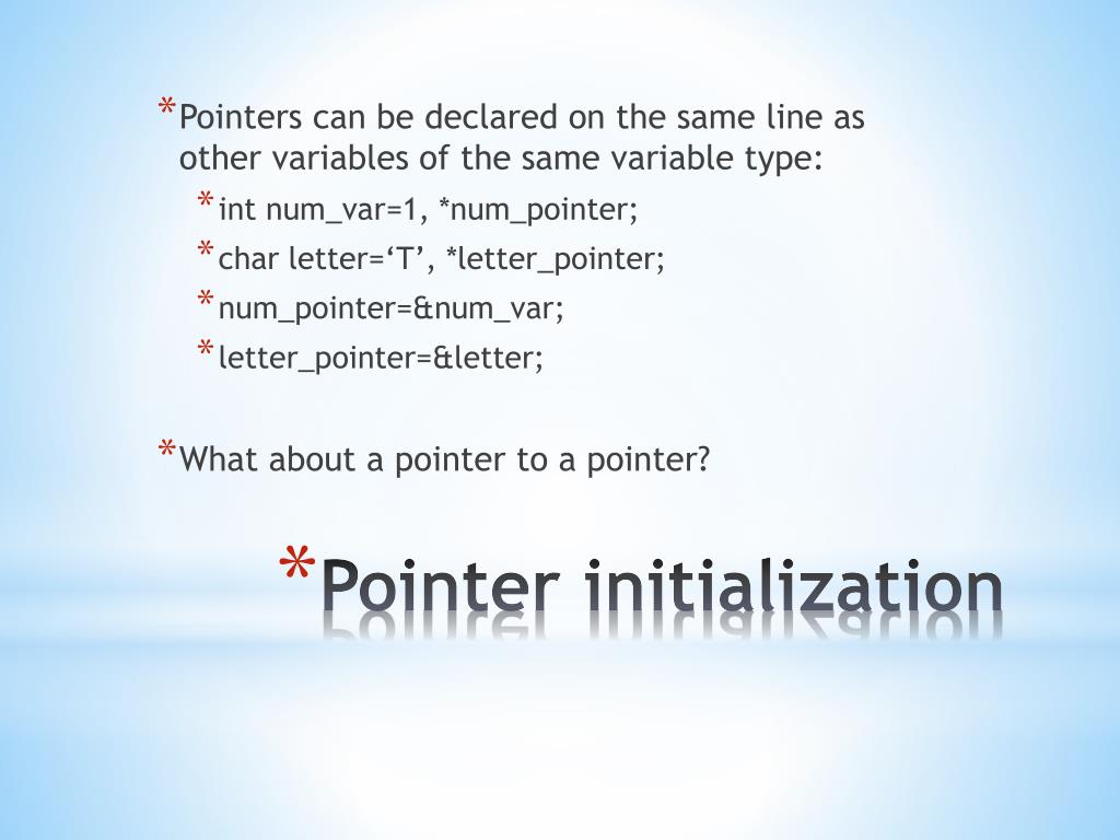 Pointers can be declared on the same line as other variables of the same variable type: • intnum_var=1, *num_pointer; • char letter=‘T’, *letter_pointer; • num_pointer=&num_var; • letter_pointer=&letter; • What about a pointer to a pointer? Pointer initialization