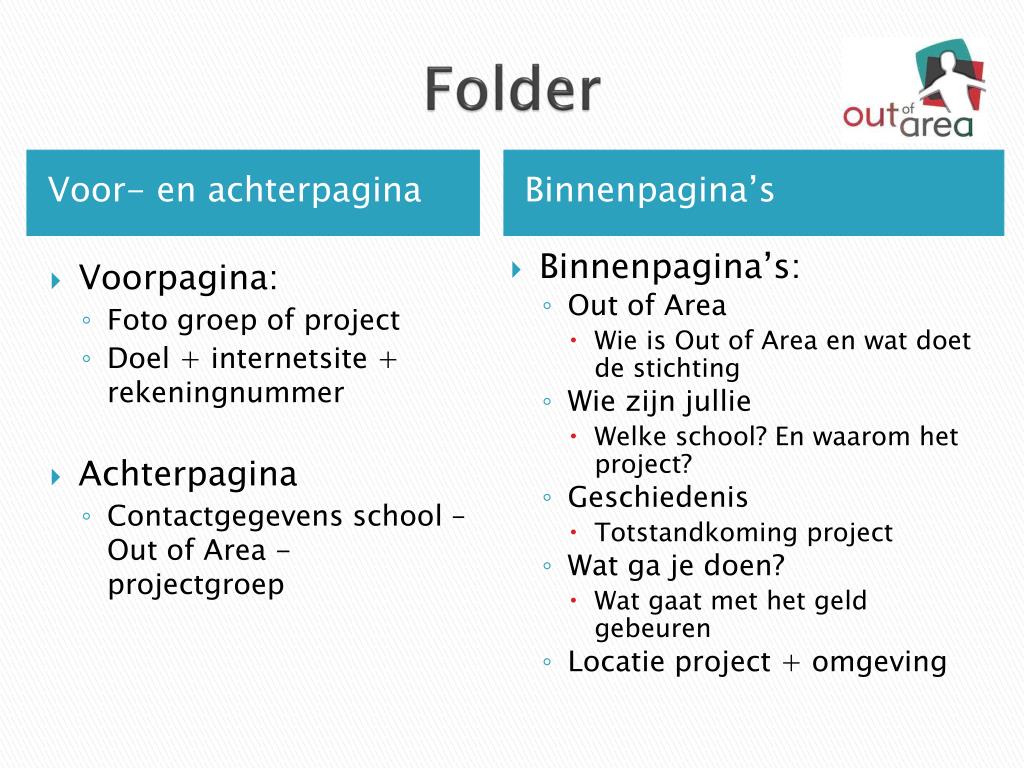 Folder • Voorpagina: • Foto groep of project • Doel + internetsite + rekeningnummer • Achterpagina • Contactgegevens school – Out of Area - projectgroep • Binnenpagina’s: • Out of Area • Wie is Out of Area en wat doet de stichting • Wie zijn jullie • Welke school? En waarom het project? • Geschiedenis • Totstandkoming project • Wat ga je doen? • Wat gaat met het geld gebeuren • Locatie project + omgeving Voor- en achterpagina Binnenpagina’s