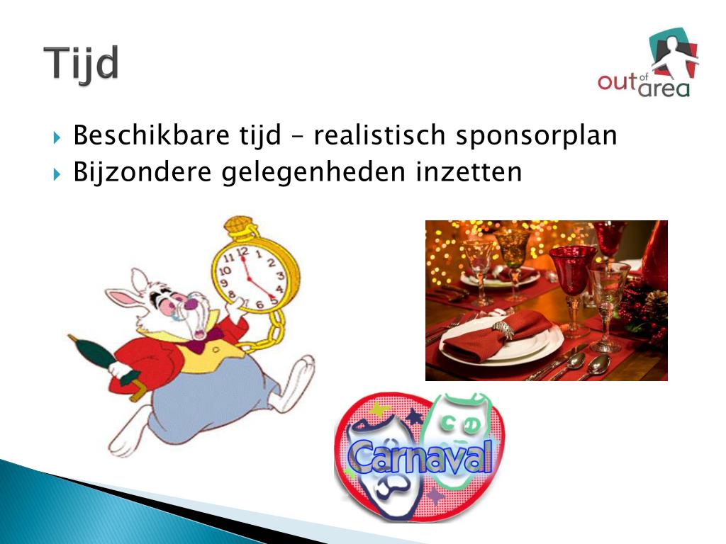 Tijd • Beschikbare tijd – realistisch sponsorplan • Bijzondere gelegenheden inzetten