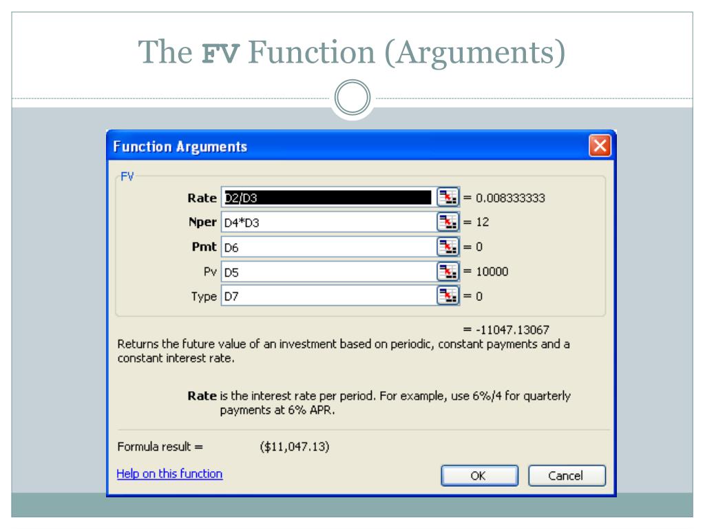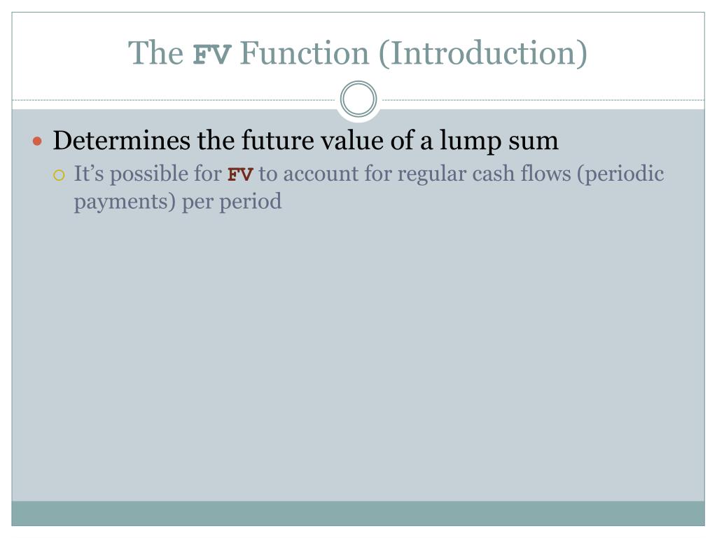 The FV Function (Introduction) • Determines the future value of a lump sum • It’s possible for FV to account for regular cash flows (periodic payments) per period