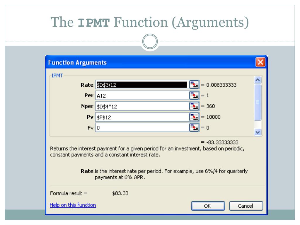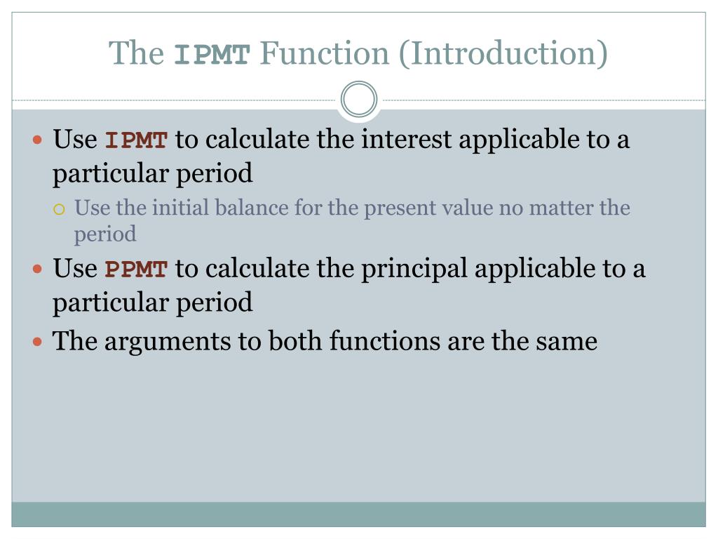 The IPMT Function (Introduction) • Use IPMT to calculate the interest applicable to a particular period • Use the initial balance for the present value no matter the period • Use PPMT to calculate the principal applicable to a particular period • The arguments to both functions are the same