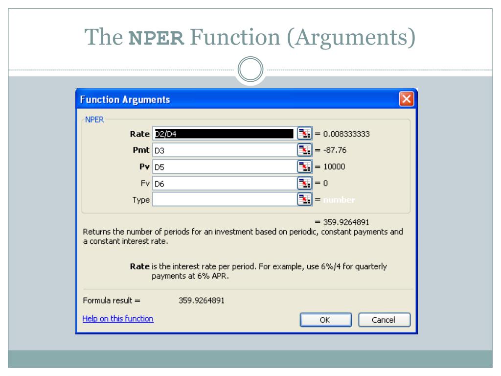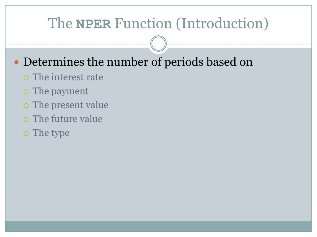 The NPER Function (Introduction) • Determines the number of periods based on • The interest rate • The payment • The present value • The future value • The type