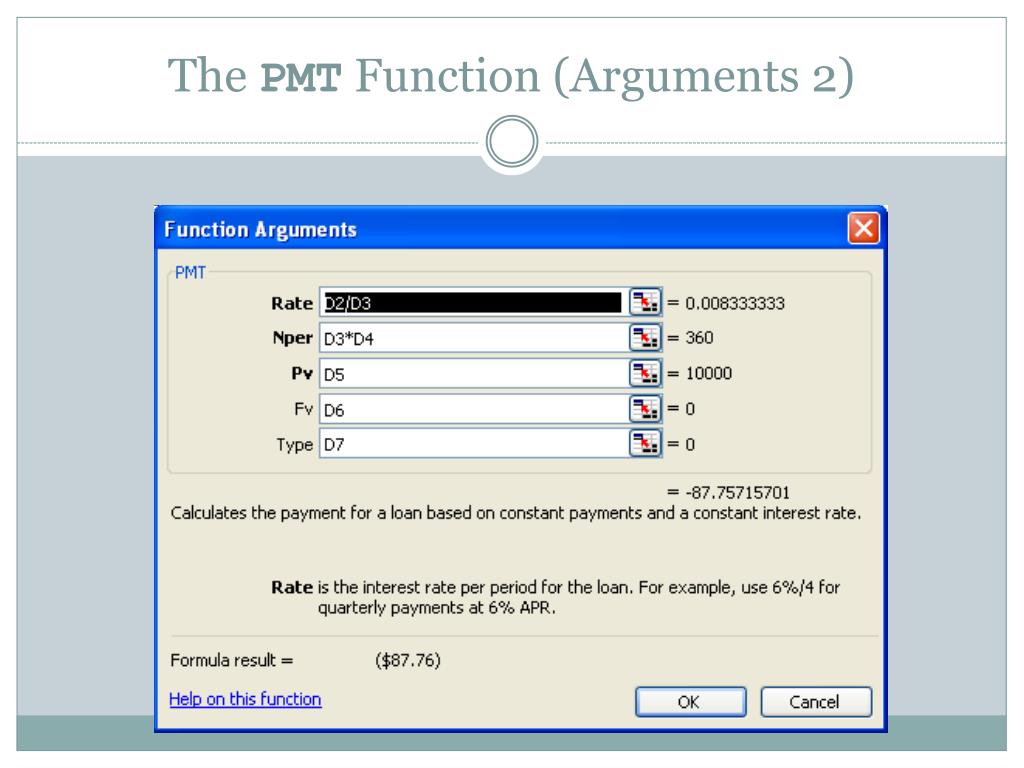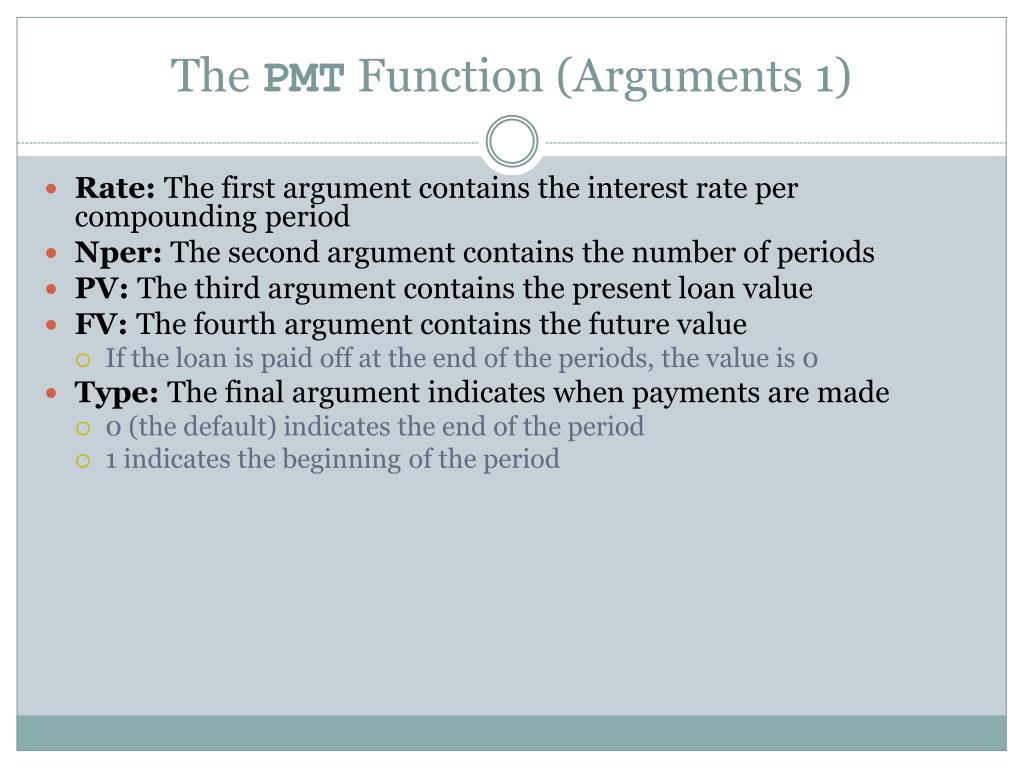 The PMT Function (Arguments 1) • Rate: The first argument contains the interest rate per compounding period • Nper: The second argument contains the number of periods • PV: The third argument contains the present loan value • FV: The fourth argument contains the future value • If the loan is paid off at the end of the periods, the value is 0 • Type: The final argument indicates when payments are made • 0 (the default) indicates the end of the period • 1 indicates the beginning of the period