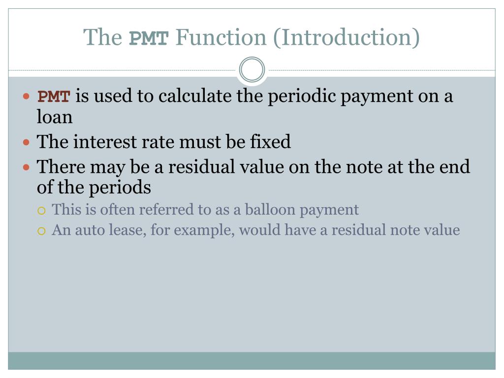 The PMT Function (Introduction) • PMT is used to calculate the periodic payment on a loan • The interest rate must be fixed • There may be a residual value on the note at the end of the periods • This is often referred to as a balloon payment • An auto lease, for example, would have a residual note value