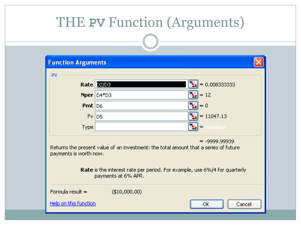 The PV Function (Introduction) Determines the present value of a cash flow Like FV, regular inflows or outflows are supported
