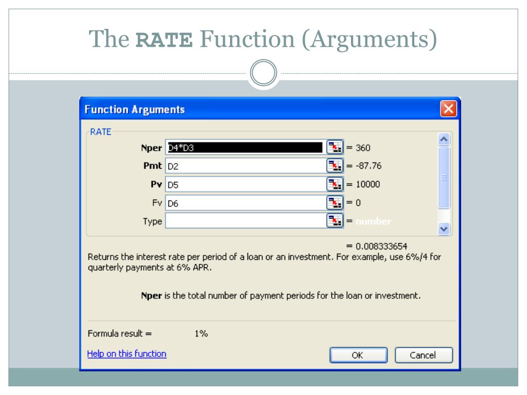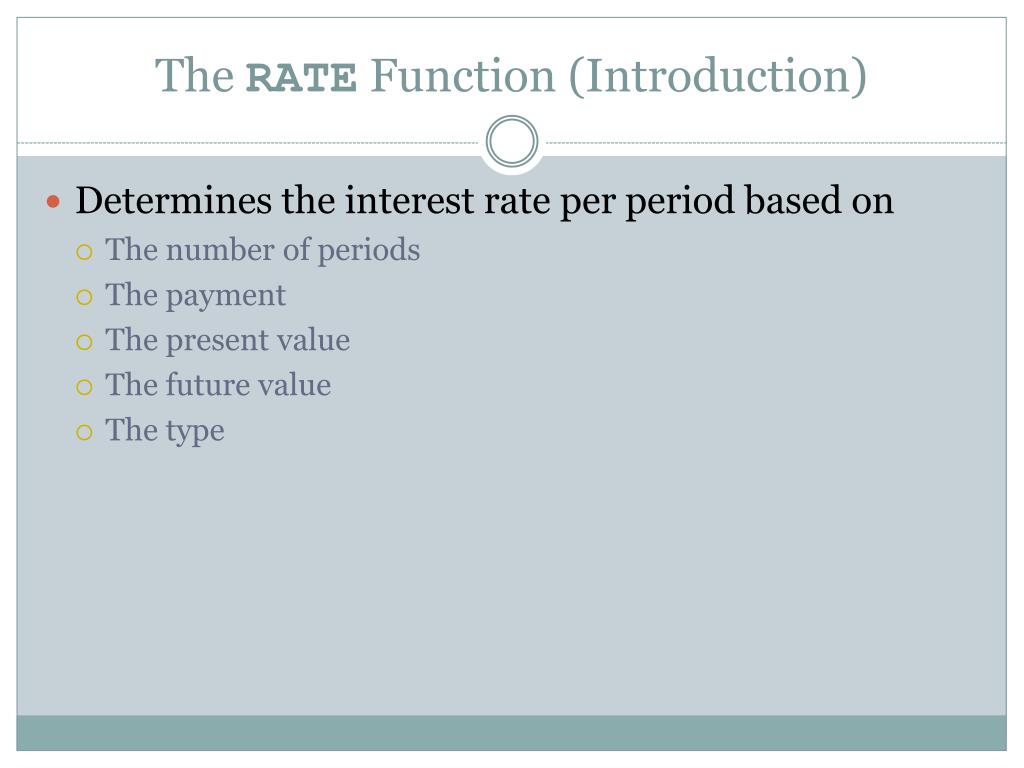 The RATE Function (Introduction) • Determines the interest rate per period based on • The number of periods • The payment • The present value • The future value • The type
