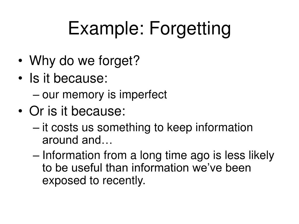 Example: Forgetting • Why do we forget? • Is it because: • our memory is imperfect • Or is it because: • it costs us something to keep information around and… • Information from a long time ago is less likely to be useful than information we’ve been exposed to recently.