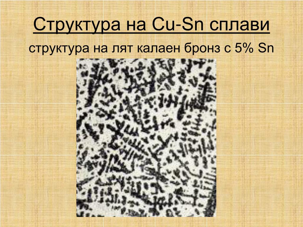 Бронзове Бронзът бива два основни вида - калаен и безкалаен.Структурата на калаения бронз се определя от диаграмата на състоянието Cu-Sn.