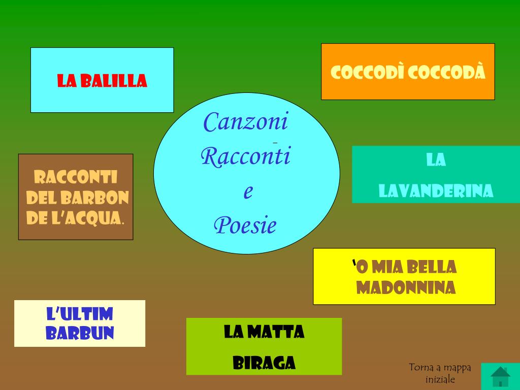 Coccodì coccodà La balilla Canzoni Racconti e Poesie La lavanderina Racconti del Barbon de l’acqua. ‘O mia bella madonnina L’ultim barbun la maTta biraga Torna a mappa iniziale