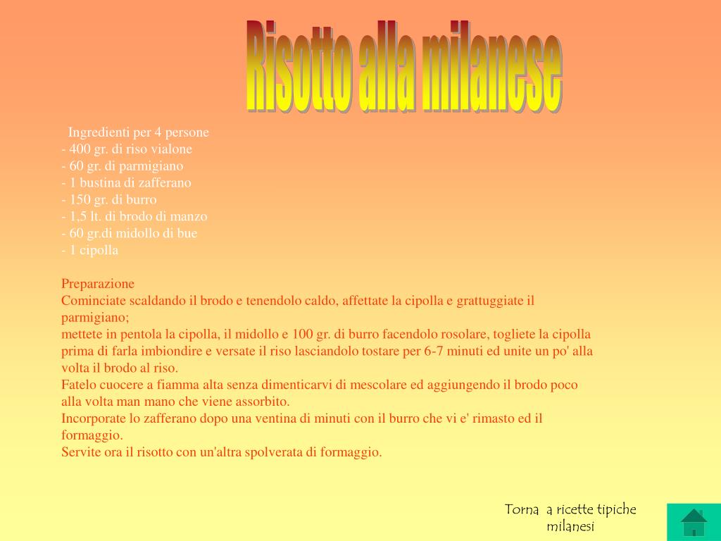 Risotto alla milanese Ingredienti per 4 persone - 400 gr. di riso vialone - 60 gr. di parmigiano - 1 bustina di zafferano - 150 gr. di burro - 1,5 lt. di brodo di manzo - 60 gr.di midollo di bue - 1 cipolla Preparazione Cominciate scaldando il brodo e tenendolo caldo, affettate la cipolla e grattuggiate il parmigiano; mettete in pentola la cipolla, il midollo e 100 gr. di burro facendolo rosolare, togliete la cipolla prima di farla imbiondire e versate il riso lasciandolo tostare per 6-7 minuti ed unite un po' alla volta il brodo al riso. Fatelo cuocere a fiamma alta senza dimenticarvi di mescolare ed aggiungendo il brodo poco alla volta man mano che viene assorbito. Incorporate lo zafferano dopo una ventina di minuti con il burro che vi e' rimasto ed il formaggio. Servite ora il risotto con un'altra spolverata di formaggio. Torna a ricette tipiche milanesi