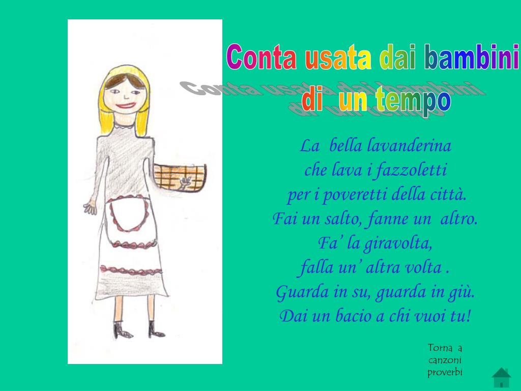 Conta usata dai bambini di un tempo La bella lavanderina che lava i fazzoletti per i poveretti della città. Fai un salto, fanne un altro. Fa’ la giravolta, falla un’ altra volta . Guarda in su, guarda in giù. Dai un bacio a chi vuoi tu! Torna a canzoni proverbi