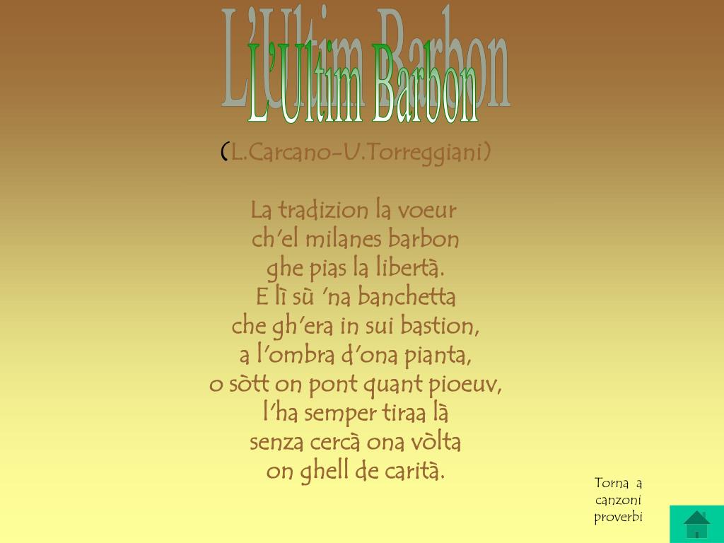 L’Ultim Barbon (L.Carcano-U.Torreggiani) La tradizion la voeur ch'el milanes barbon ghe pias la libertà. E lì sù 'na banchetta che gh'era in sui bastion, a l'ombra d'ona pianta, o sòtt on pont quant pioeuv, l'ha semper tiraa là senza cercà ona vòlta on ghell de carità. Torna a canzoni proverbi