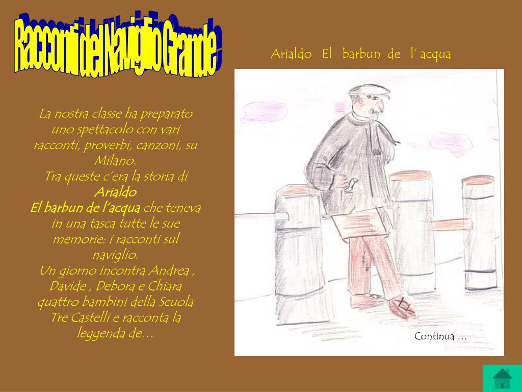 Racconti del Naviglio Grande Arialdo El barbun de l’ acqua La nostra classe ha preparato uno spettacolo con vari racconti, proverbi, canzoni, su Milano. Tra queste c’era la storia di Arialdo El barbun de l’acqua che teneva in una tasca tutte le sue memorie: i racconti sul naviglio. Un giorno incontra Andrea , Davide , Debora e Chiara quattro bambini della Scuola Tre Castelli e racconta la leggenda de… Continua …