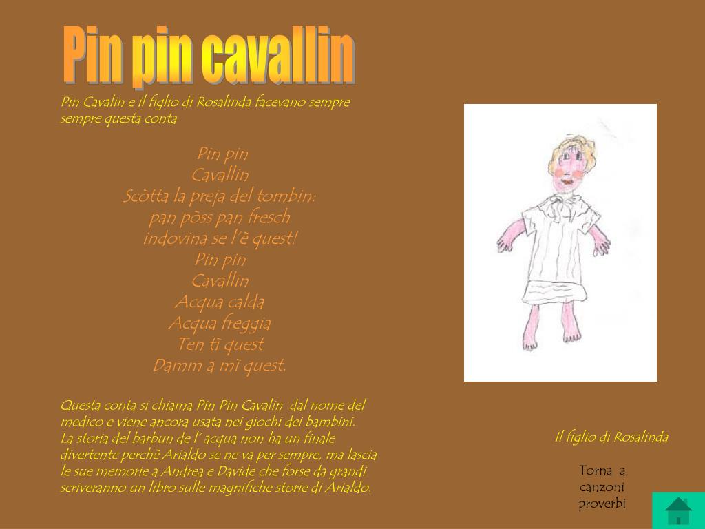 Pin pin cavallin Pin Cavalin e il figlio di Rosalinda facevano sempre sempre questa conta Pin pin Cavallin Scòtta la preja del tombin: pan pòss pan fresch indovina se l’è quest! Pin pin Cavallin Acqua calda Acqua freggia Ten tì quest Damm a mì quest. Questa conta si chiama Pin Pin Cavalin dal nome del medico e viene ancora usata nei giochi dei bambini. La storia del barbun de l’ acqua non ha un finale divertente perchè Arialdo se ne va per sempre, ma lascia le sue memorie a Andrea e Davide che forse da grandi scriveranno un libro sulle magnifiche storie di Arialdo. Il figlio di Rosalinda Torna a canzoni proverbi