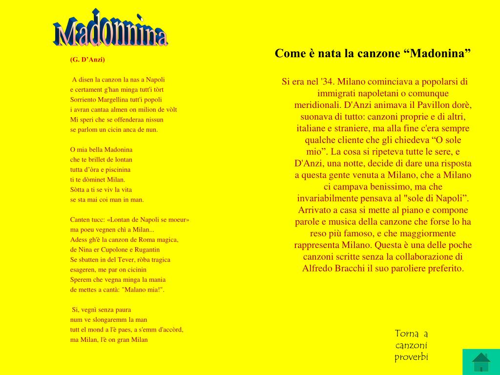 Madonnina Come è nata la canzone “Madonina” Si era nel '34. Milano cominciava a popolarsi di immigrati napoletani o comunque meridionali. D'Anzi animava il Pavillon dorè, suonava di tutto: canzoni proprie e di altri, italiane e straniere, ma alla fine c'era sempre qualche cliente che gli chiedeva “O sole mio”. La cosa si ripeteva tutte le sere, e D'Anzi, una notte, decide di dare una risposta a questa gente venuta a Milano, che a Milano ci campava benissimo, ma che invariabilmente pensava al "sole di Napoli”. Arrivato a casa si mette al piano e compone parole e musica della canzone che forse lo ha reso più famoso, e che maggiormente rappresenta Milano. Questa è una delle poche canzoni scritte senza la collaborazione di Alfredo Bracchi il suo paroliere preferito. (G. D’Anzi) A disen la canzon la nas a Napoli e certament g'han minga tutt'i tòrt Sorriento Margellina tutt'i popoli i avran cantaa almen on milion de vòlt Mi speri che se offenderaa nissun se parlom un cicin anca de nun. O mia bella Madonina che te brillet de lontan tutta d’òra e piscinina ti te dòminet Milan. Sòtta a ti se viv la vita se sta mai coi man in man. Canten tucc: «Lontan de Napoli se moeur» ma poeu vegnen chì a Milan... Adess gh'è la canzon de Roma magica, de Nina er Cupolone e Rugantin Se sbatten in del Tever, ròba tragica esageren, me par on cicinin Sperem che vegna minga la mania de mettes a cantà: "Malano mia!". Si, vegnì senza paura num ve slongaremm la man tutt el mond a l'è paes, a s'emm d'accòrd, ma Milan, l'è on gran Milan Torna a canzoni proverbi