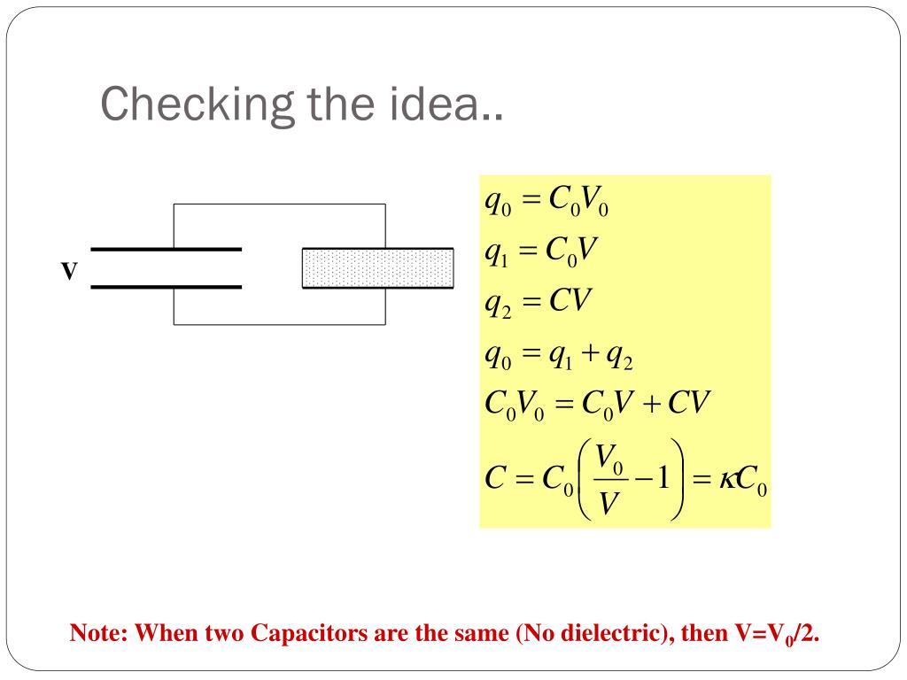V Checking the idea.. Note: When two Capacitors are the same (No dielectric), then V=V0/2.