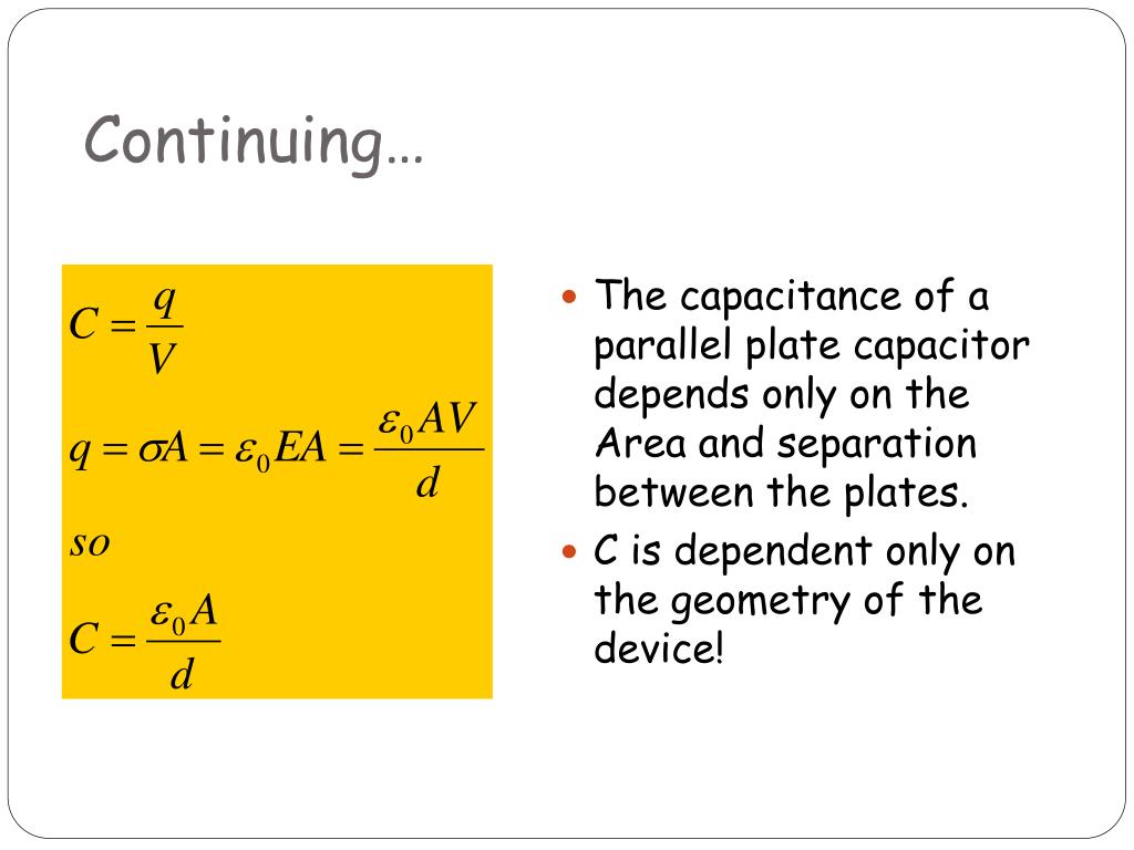 Continuing… • The capacitance of a parallel plate capacitor depends only on the Area and separation between the plates. • C is dependent only on the geometry of the device!