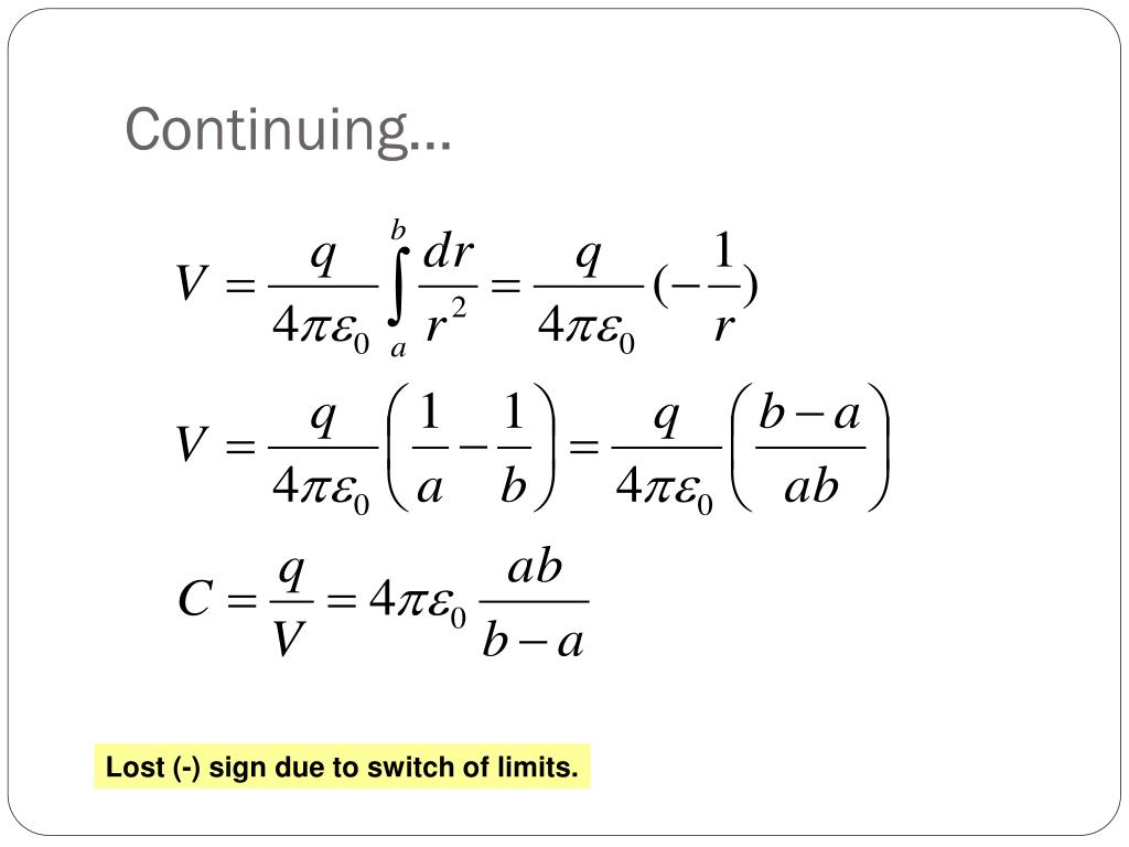 Calculate Potential Difference V (-) sign because E and ds are in OPPOSITE directions.