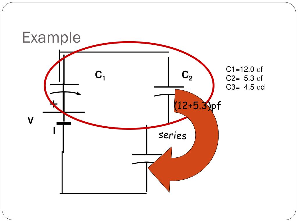 Example C1=12.0 uf C2= 5.3 uf C3= 4.5 ud C1 C2 series (12+5.3)pf (12+5.3)pf V C3