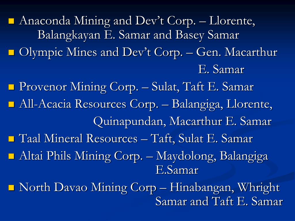 Anaconda Mining and Dev’t Corp. – Llorente, Balangkayan E. Samar and Basey Samar • Olympic Mines and Dev’t Corp. – Gen. Macarthur E. Samar • Provenor Mining Corp. – Sulat, Taft E. Samar • All-Acacia Resources Corp. – Balangiga, Llorente, Quinapundan, Macarthur E. Samar • Taal Mineral Resources – Taft, Sulat E. Samar • Altai Phils Mining Corp. – Maydolong, Balangiga E.Samar • North Davao Mining Corp – Hinabangan, Whright Samar and Taft E. Samar