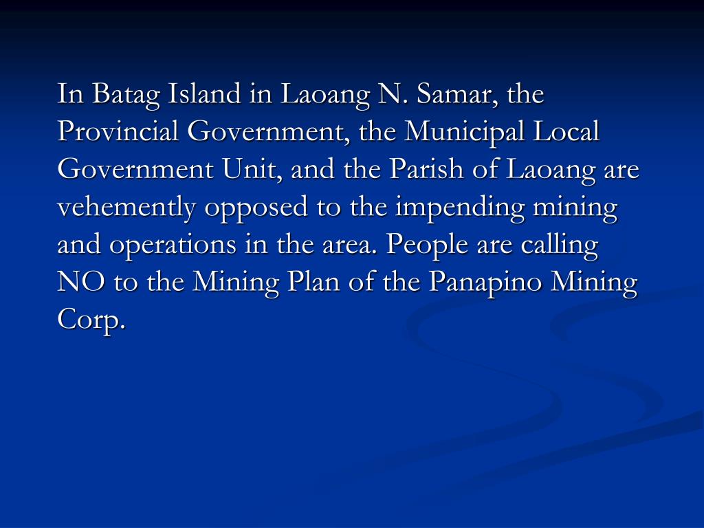In Batag Island in Laoang N. Samar, the Provincial Government, the Municipal Local Government Unit, and the Parish of Laoang are vehemently opposed to the impending mining and operations in the area. People are calling NO to the Mining Plan of the Panapino Mining Corp.