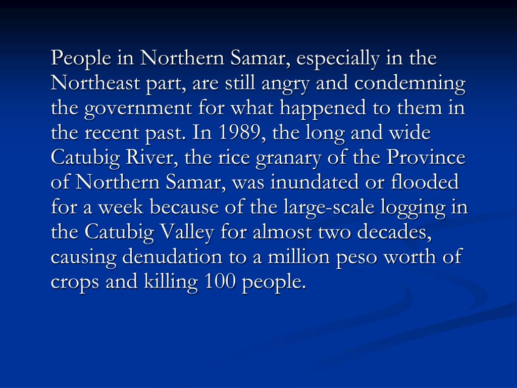 People in Northern Samar, especially in the Northeast part, are still angry and condemning the government for what happened to them in the recent past. In 1989, the long and wide Catubig River, the rice granary of the Province of Northern Samar, was inundated or flooded for a week because of the large-scale logging in the Catubig Valley for almost two decades, causing denudation to a million peso worth of crops and killing 100 people.