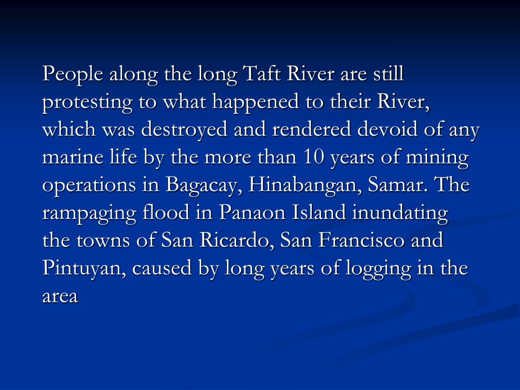 People along the long Taft River are still protesting to what happened to their River, which was destroyed and rendered devoid of any marine life by the more than 10 years of mining operations in Bagacay, Hinabangan, Samar. The rampaging flood in Panaon Island inundating the towns of San Ricardo, San Francisco and Pintuyan, caused by long years of logging in the area