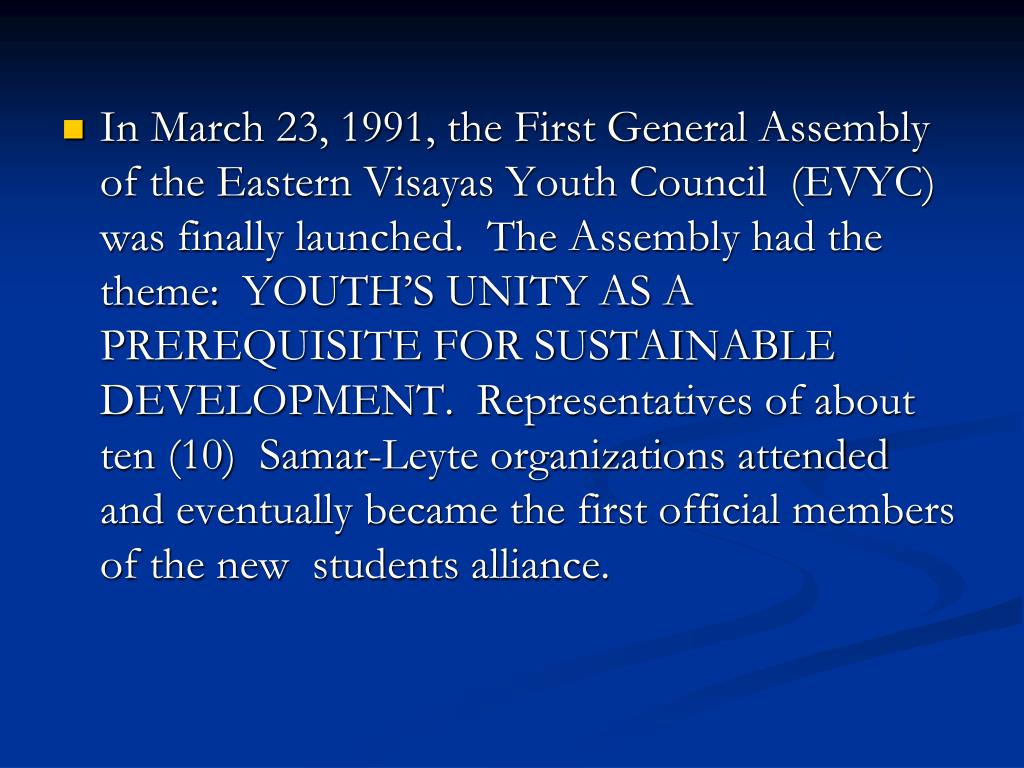 In March 23, 1991, the First General Assembly of the Eastern Visayas Youth Council (EVYC) was finally launched. The Assembly had the theme: YOUTH’S UNITY AS A PREREQUISITE FOR SUSTAINABLE DEVELOPMENT. Representatives of about ten (10) Samar-Leyte organizations attended and eventually became the first official members of the new students alliance.