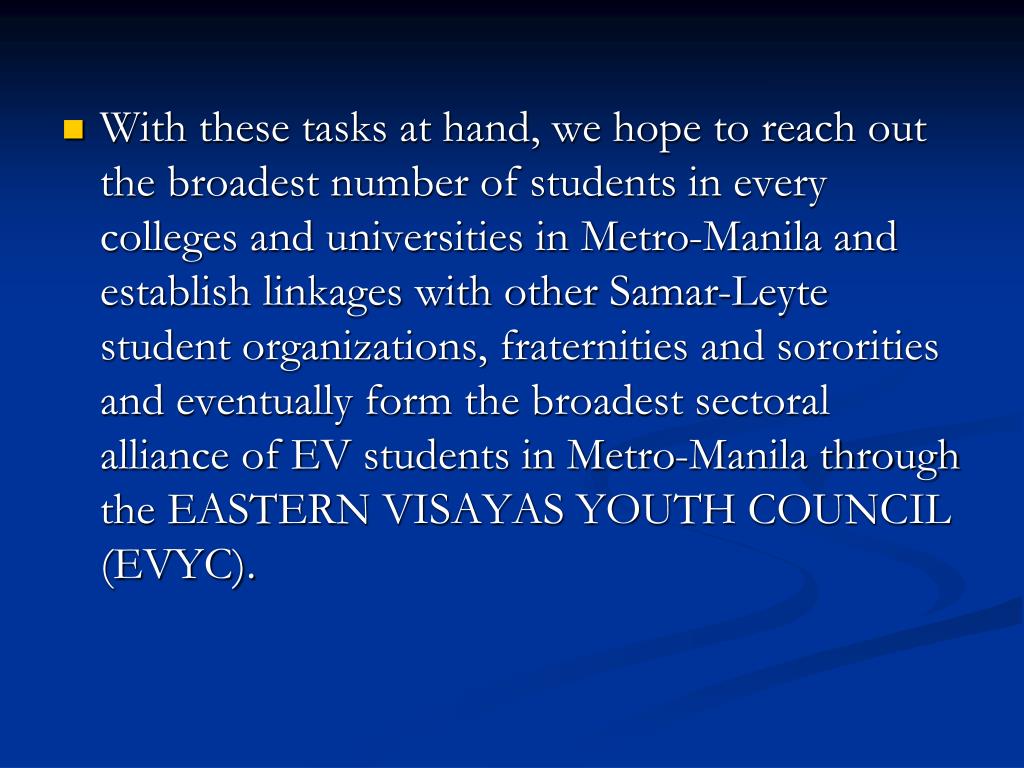 With these tasks at hand, we hope to reach out the broadest number of students in every colleges and universities in Metro-Manila and establish linkages with other Samar-Leyte student organizations, fraternities and sororities and eventually form the broadest sectoral alliance of EV students in Metro-Manila through the EASTERN VISAYAS YOUTH COUNCIL (EVYC).