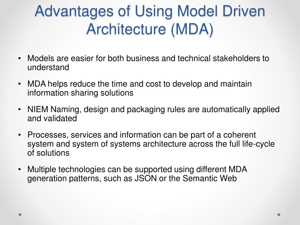 Advantages of Using Model Driven Architecture (MDA) • Models are easier for both business and technical stakeholders to understand • MDA helps reduce the time and cost to develop and maintain information sharing solutions • NIEM Naming, design and packaging rules are automatically applied and validated • Processes, services and information can be part of a coherent system and system of systems architecture across the full life-cycle of solutions • Multiple technologies can be supported using different MDA generation patterns, such as JSON or the Semantic Web