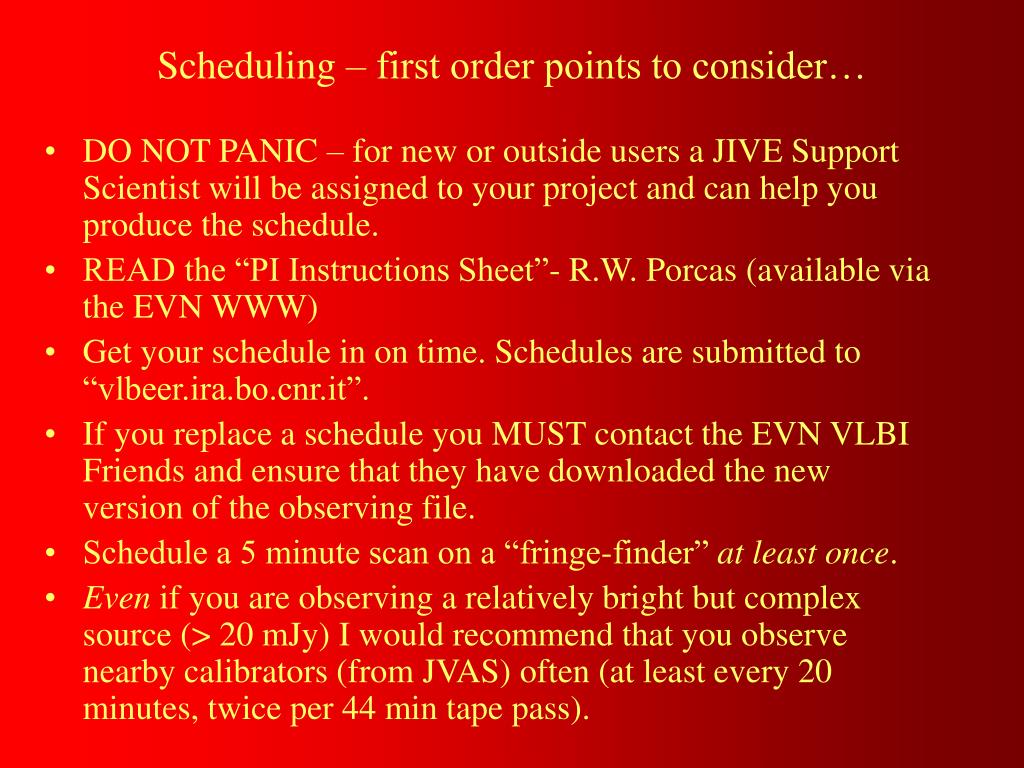 Scheduling – first order points to consider… • DO NOT PANIC – for new or outside users a JIVE Support Scientist will be assigned to your project and can help you produce the schedule. • READ the “PI Instructions Sheet”- R.W. Porcas (available via the EVN WWW) • Get your schedule in on time. Schedules are submitted to “vlbeer.ira.bo.cnr.it”. • If you replace a schedule you MUST contact the EVN VLBI Friends and ensure that they have downloaded the new version of the observing file. • Schedule a 5 minute scan on a “fringe-finder” at least once. • Even if you are observing a relatively bright but complex source (> 20 mJy) I would recommend that you observe nearby calibrators (from JVAS) often (at least every 20 minutes, twice per 44 min tape pass).